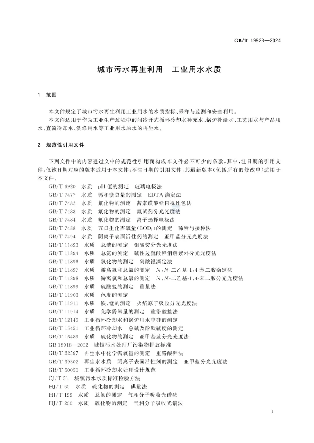 國家市場監(jiān)督管理總局、國家標(biāo)準(zhǔn)化管理委員會發(fā)布2024 年第 1 號國家標(biāo)準(zhǔn)公告,GB/T 19923-2024《城市污水再生利用 工業(yè)用水水質(zhì)》于2024年3月15 日正式發(fā)布,10 月 1 日起正式實(shí)施。