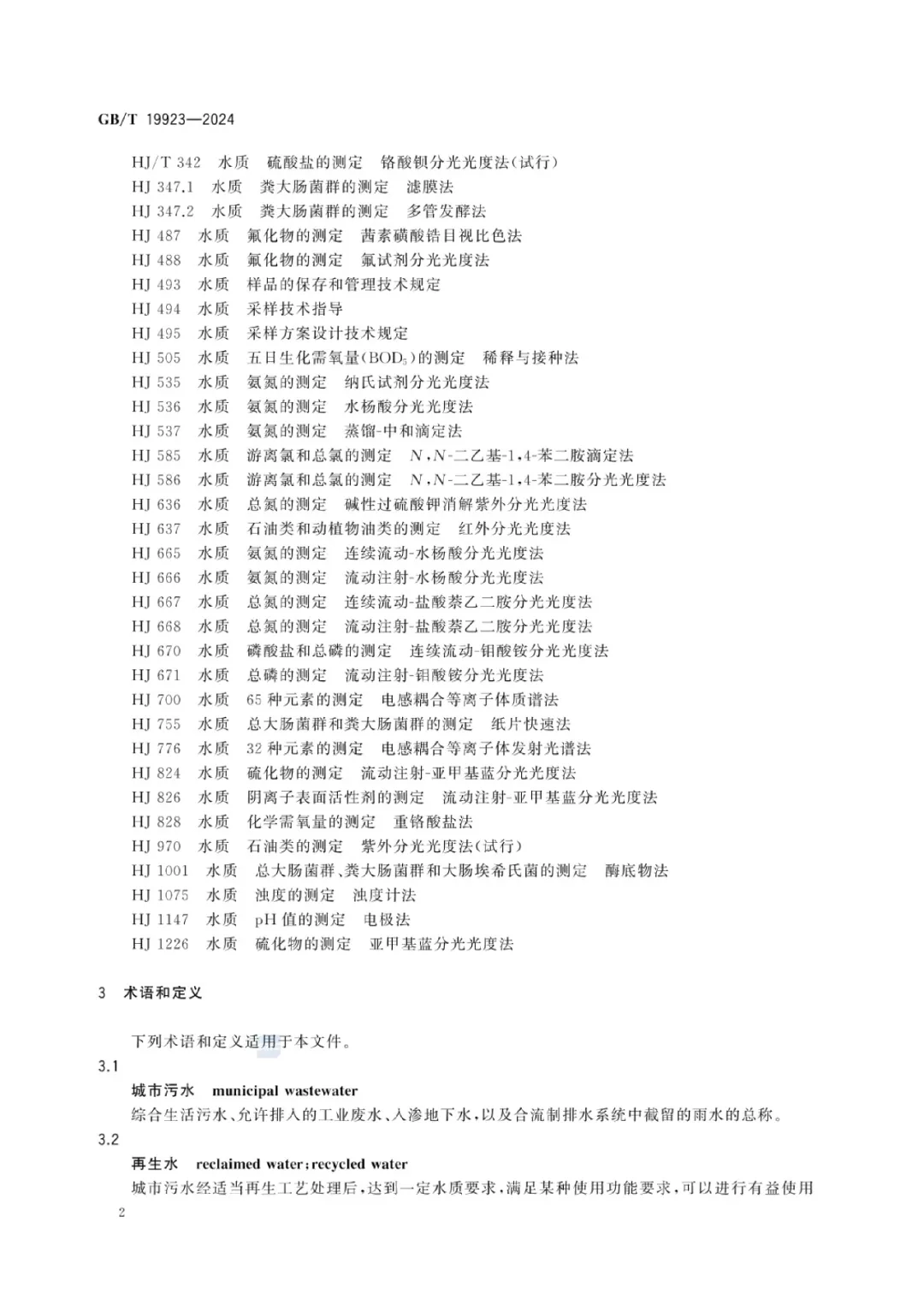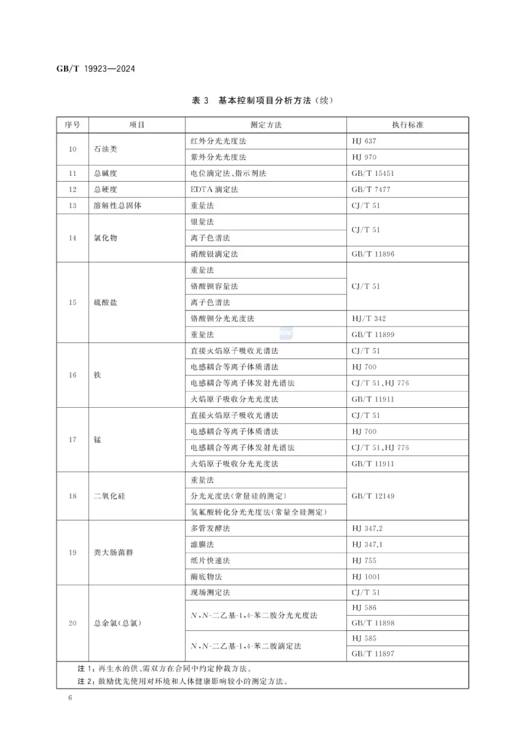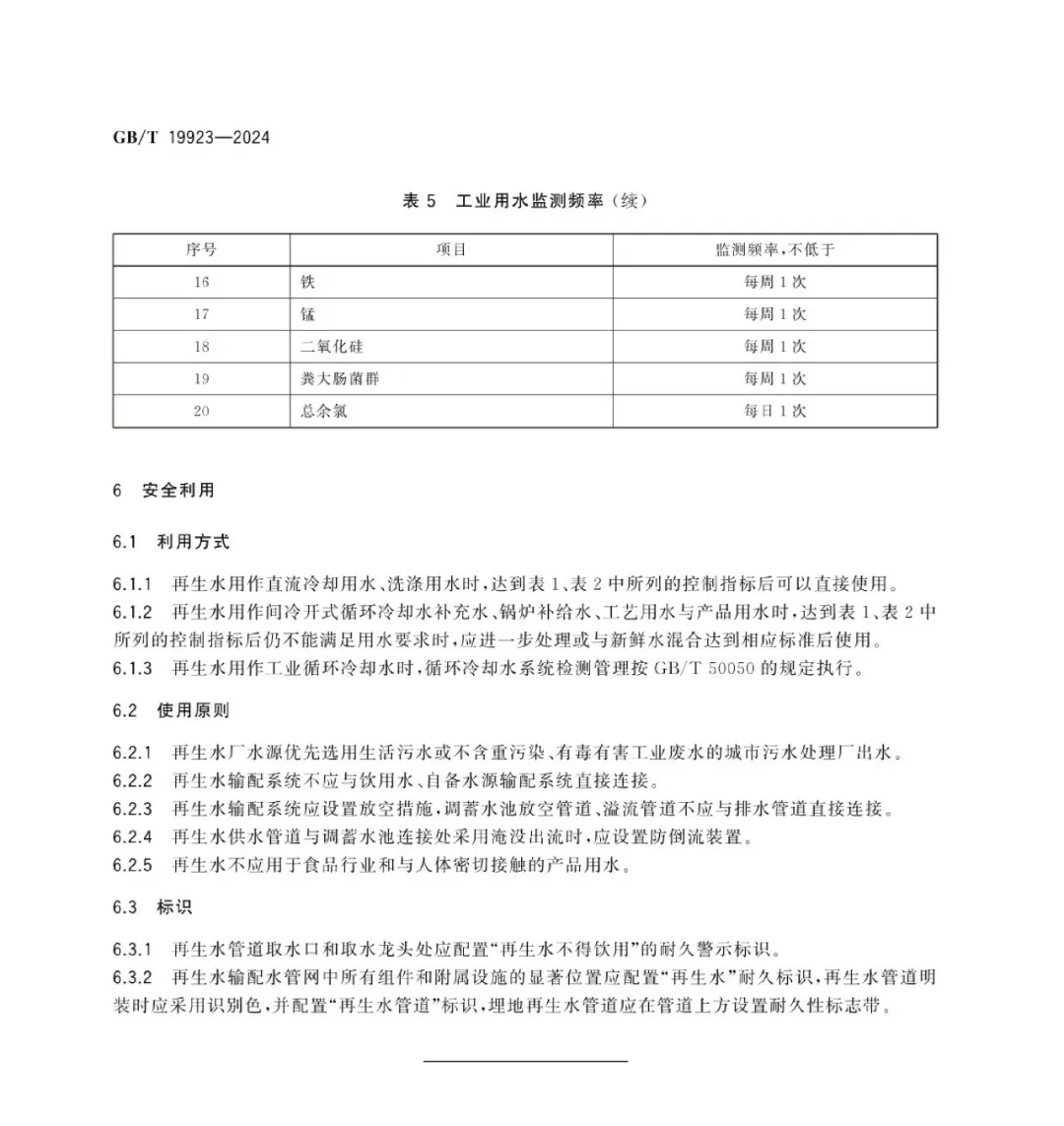 GB/T19923-2024《城市污水再生利用 工業(yè)用水水質(zhì)》具有以下創(chuàng)新點(diǎn): (1)與新加坡公用事業(yè)局制定的《供水應(yīng)用手冊》和《新加坡中水回用技術(shù)指南第一版》、美國環(huán)境保護(hù)署(EPA)《2012 再生水利用指南》、歐盟水回用法規(guī)(Regulation(EU)2020/741);世界衛(wèi)生組織(WHO)頒布的《廢水、污水和灰水安全使用指南》;ISO《工業(yè)冷卻系統(tǒng)中再生水的使用第1 部分:技術(shù)準(zhǔn)則》和《工業(yè)廢水軟化和脫鹽回用指南》。等國家和國際組織的標(biāo)準(zhǔn)進(jìn)行了對標(biāo),通過參考國際標(biāo)準(zhǔn)和先進(jìn)國家的標(biāo)準(zhǔn),使修訂后標(biāo)準(zhǔn)的科學(xué)性、先進(jìn)性有較大提高;(2)為進(jìn)一步擴(kuò)大再生水工業(yè)回用量,推動節(jié)水型社會建設(shè),在保障工業(yè)用水安全的前提下,簡化了水質(zhì)分類、將水質(zhì)指標(biāo)調(diào)整為基本控制項目和選擇性控制項目;取消了1 項指標(biāo),增加了 3 項指標(biāo),修改了16 項指標(biāo)限值;(3)針對我國幅員遼闊,各地城市用水水源中離子性指標(biāo)差別較大,導(dǎo)致城市污水中硬度、氯離子和硫酸根離子可能有幾倍到幾十倍的差別;不同的回用途徑對上述離子濃度的要求也有很大差別。為提高標(biāo)準(zhǔn)的適用性和覆蓋性,將工業(yè)用水水質(zhì)指標(biāo)調(diào)整為一般性控制指標(biāo)和選擇性控制指標(biāo),供需雙方可根據(jù)當(dāng)?shù)氐膶?shí)際情況選擇控制;(4)《城市污水再生利用工業(yè)用水水質(zhì)》控制項目22個,在同系列標(biāo)準(zhǔn)中控制項目最多。目前,我國的水質(zhì)檢測有國標(biāo)GB標(biāo)準(zhǔn)、生態(tài)環(huán)境部的HJ 標(biāo)準(zhǔn)和住房和城鄉(xiāng)建設(shè)部的CJ標(biāo)準(zhǔn)。經(jīng)過梳理,本標(biāo)準(zhǔn)包含的22個控制項目涉及現(xiàn)行國標(biāo)27部,行標(biāo)36部,多數(shù)控制項目有3種及以上的分析方法,在編制過程中,對以上水質(zhì)檢測方法進(jìn)行了全面梳理,從降低水質(zhì)檢測環(huán)境影響和對人體健康風(fēng)險、不推薦采用禁用物質(zhì)的檢測方法、降低化驗室管理成本等原則出發(fā)推薦了水質(zhì)檢測方法。